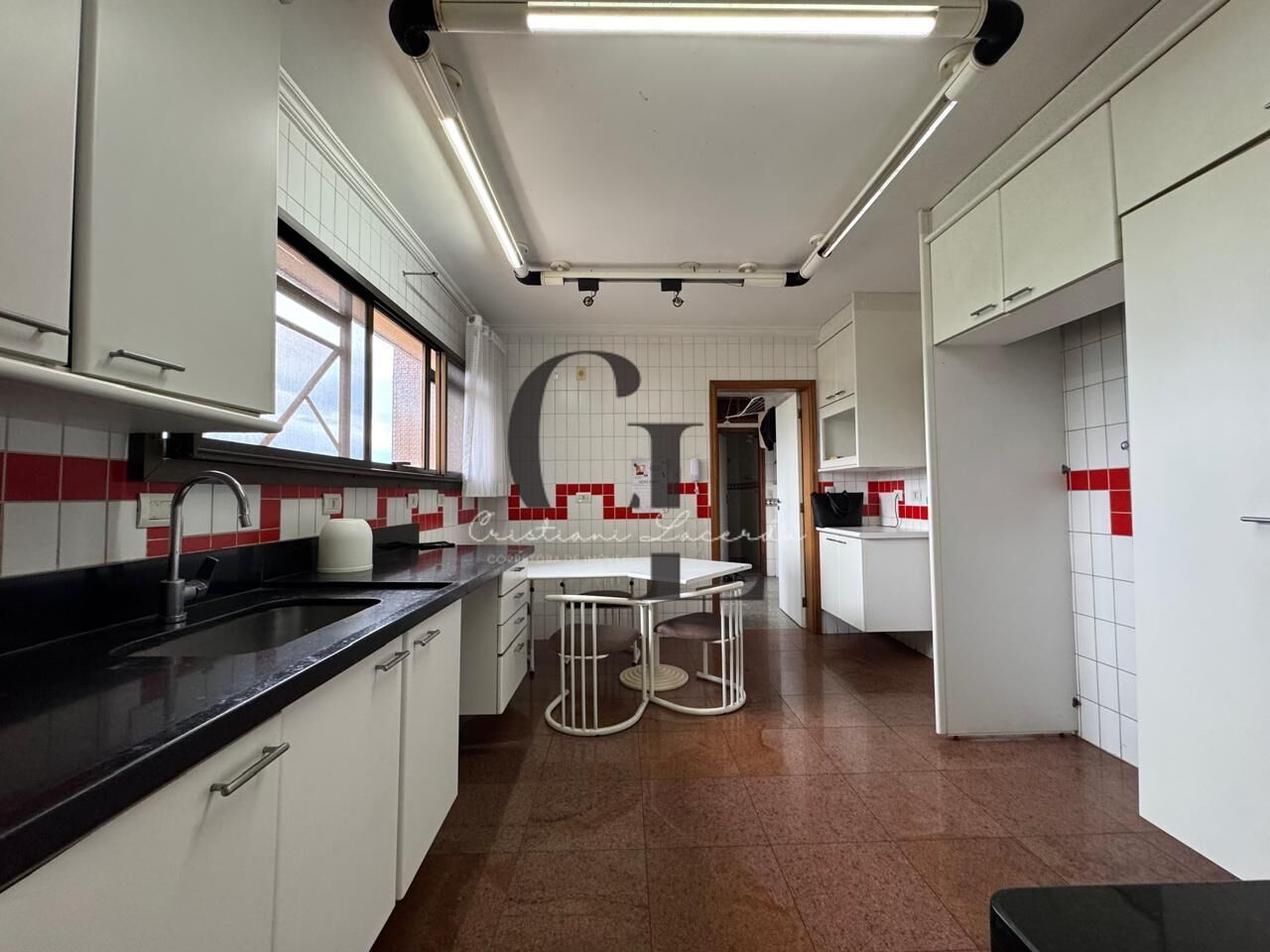 Cozinha com armários planejados, entrada de serviço e área de serviço generosa com dependência e banheiro.