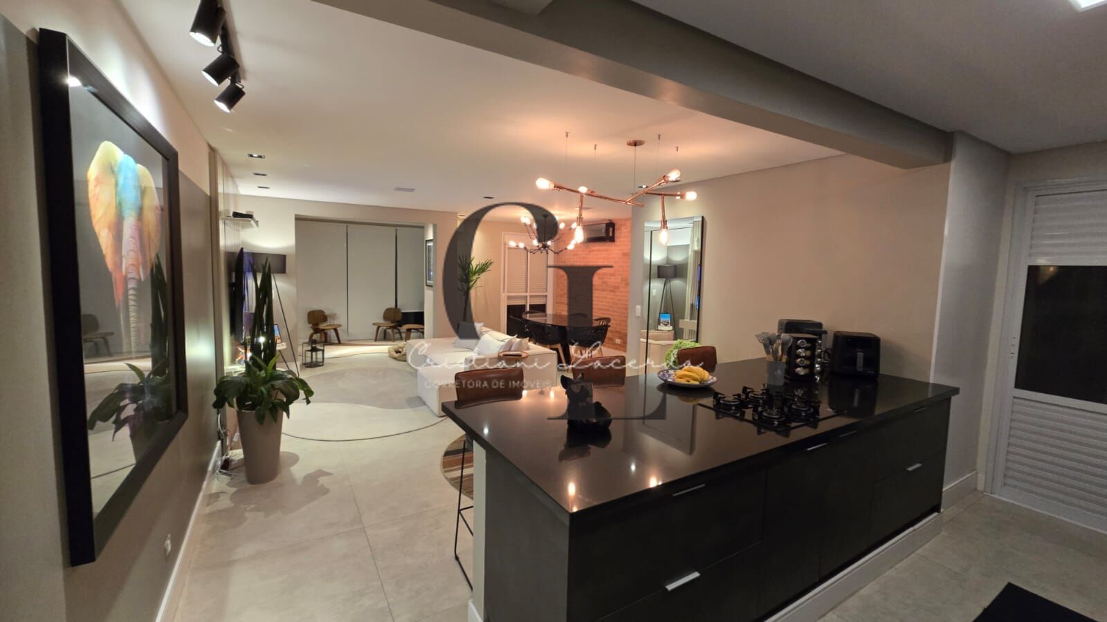 Cozinha em conceito aberto com armários planejados, forno e cooktop embutidos.