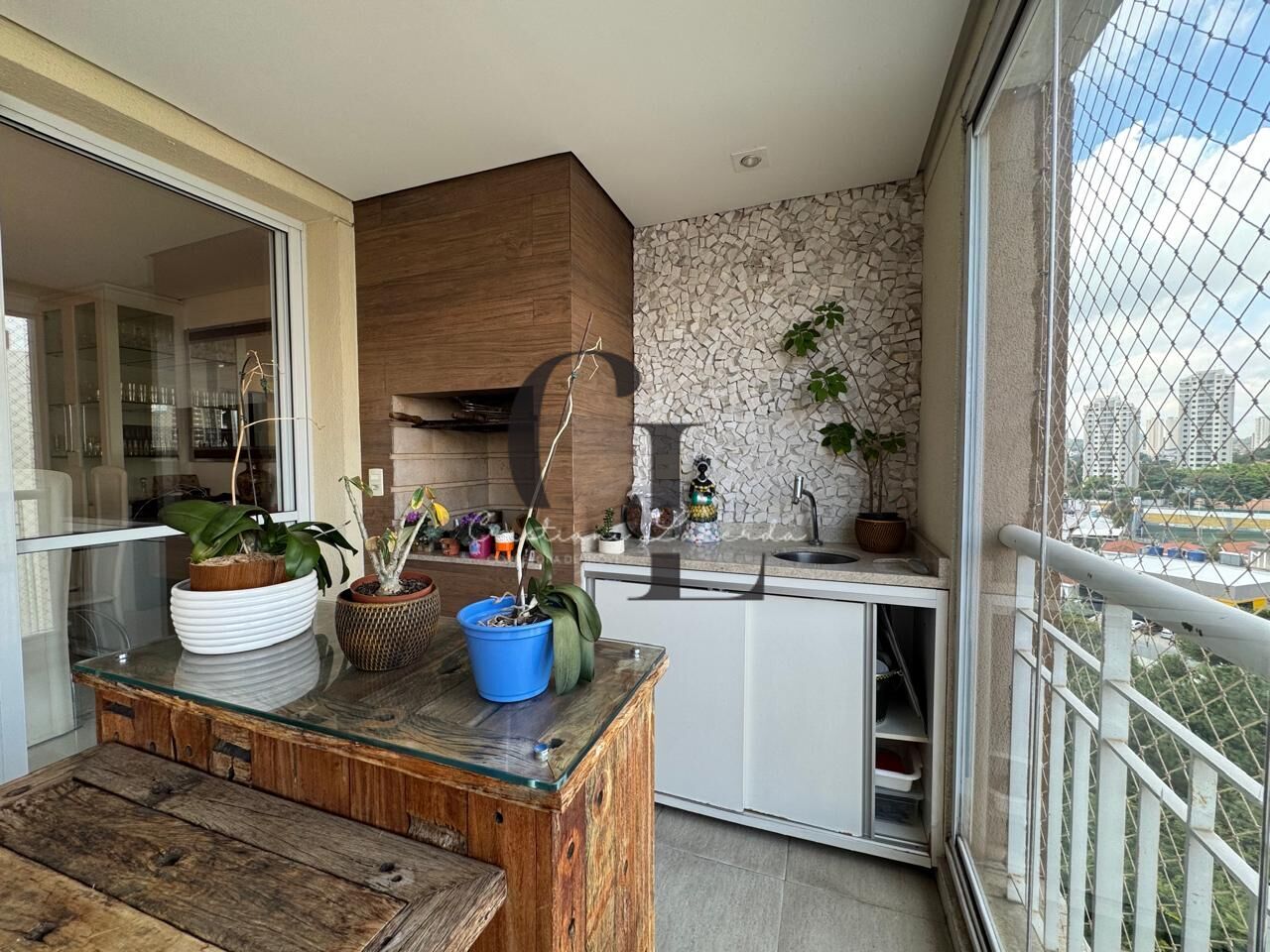 Varanda gourmet espaçosa com churrasqueira a carvão e fechamento em vidro.