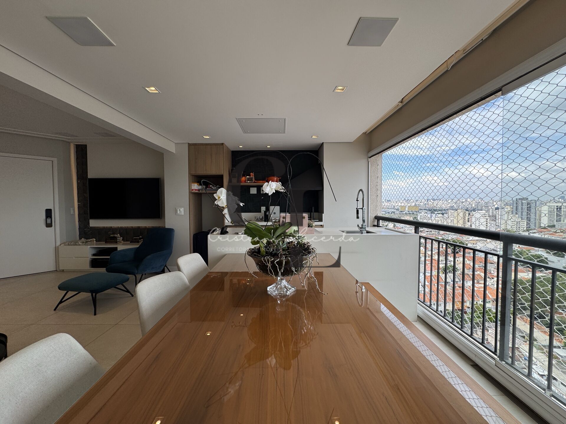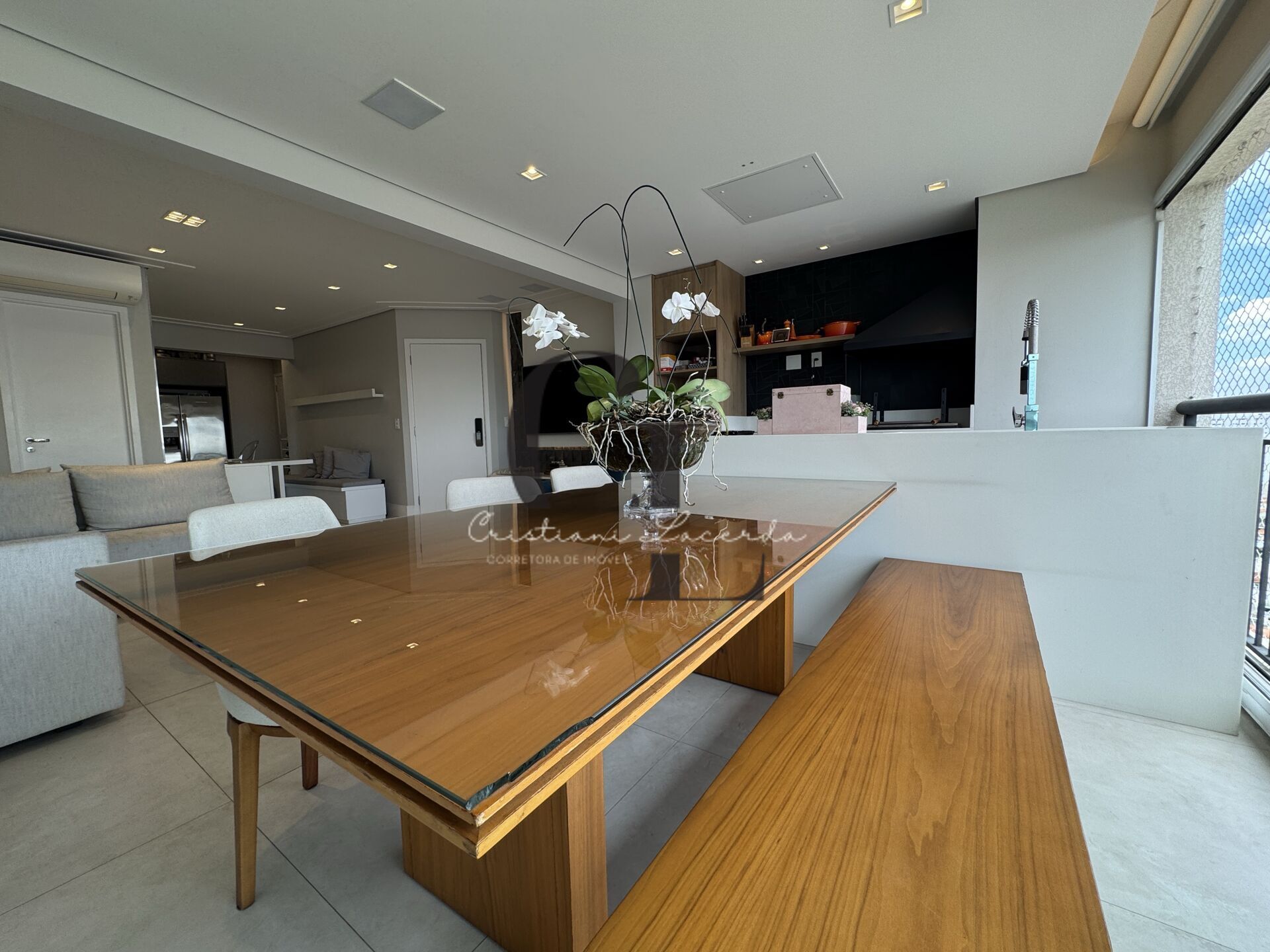 Conceito aberto que integra cozinha, varanda gourmet - com churrasqueira a carvão - e salas de estar e jantar + lavabo.