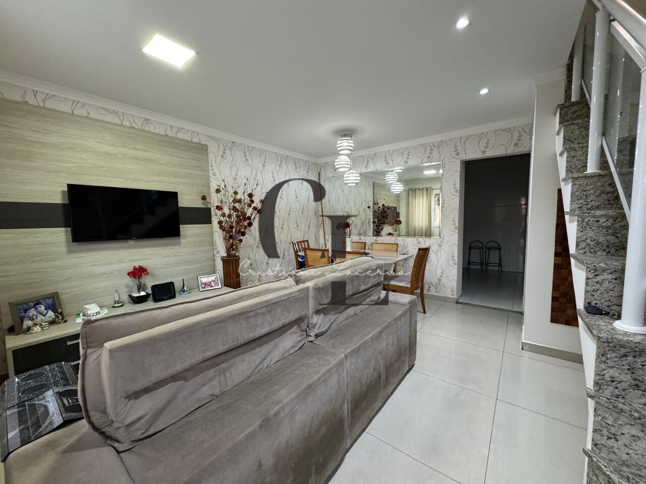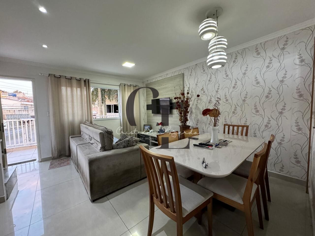 Salas de estar e jantar, lavabo, cozinha com armários planejados e área de serviço.
