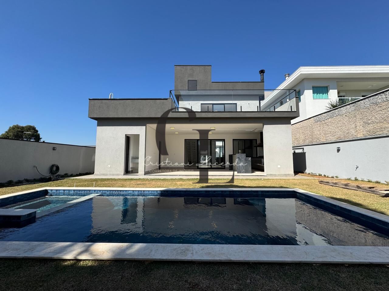 Na área externa, quintal gramado, piscina com hidromassagem, banheiro externo e espaço gourmet.